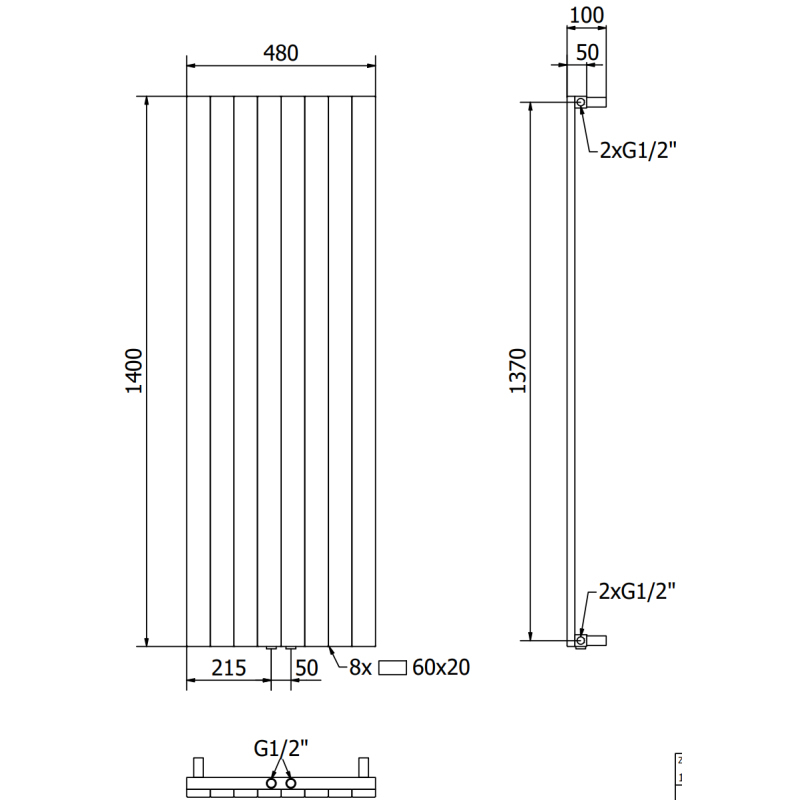 Technické údaje: Výška: 1400 mm Šírka: 480 mm Hĺbka: 60 mm Rozstup pripojenia: - 135 cm (bočne) alebo 5 cm (uprostred) Farba: Čierna RAL 9005 Materiál: Oceľ Hmotnosť: 22,86 kg Reakcia na oheň: A1 Prevádzková teplota: 0 Maximálna prevádzková teplota: 1 Vykurovací výkon: - 75/65/20 °C - 950 W Pripojenie: - 2xG ½″ uprostred - 4xG ½″ zhora a zdola na pravej alebo ľavej strane Vysoko kvalitný, odolný antikorózny náter Sada obsahuje: závesy, montážnu sadu, záslepky a odvzdušňovací otvor