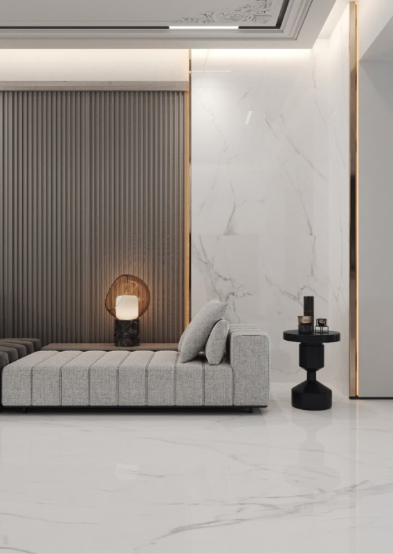 Rektifikované. Mrazuvzdorné. Dlažba vo farbe white av imitácii mramoru o rozmere 60x120 cm a hrúbke 6 mm s lešteným povrchom. Vhodné iba do interiéru.