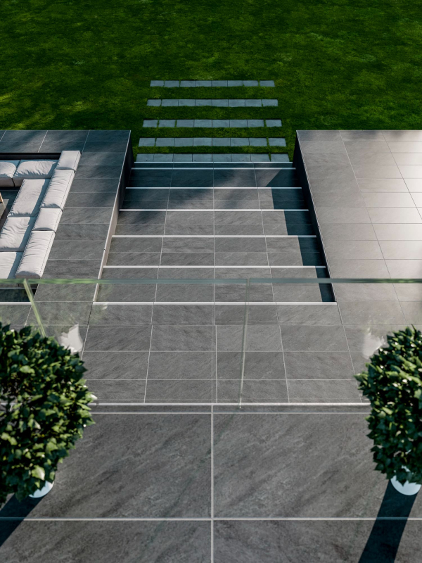 Mrazuvzdorná a rektifikovaná dlažba v šedej farbe v imitácii kameňa s rozmerom 60x60 cm a hrúbkou 20 mm s matným povrchom. Vhodné do exteriéru, určené predovšetkým na inštaláciu na terče, do stierku či trávnika, prípadne je možné aj lepiť cementovými lepidlami na to určenými. Vysoko odolné proti opotrebovaniu. Vhodné na terasy, balkón, chodníky alebo ako dlažba k bazénu.
