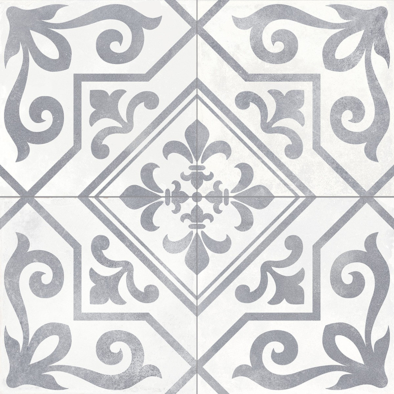 Dlažba v šedej farbe v retro dizajne o rozmere 45,2x45,2 cm a hrúbke 10 mm s matným povrchom. Vhodné do exteriéru aj interiéru. S malými rozdielmi v odtieni farieb, štruktúry povrchu a kresby. Vhodné do kuchyne, kancelárií.