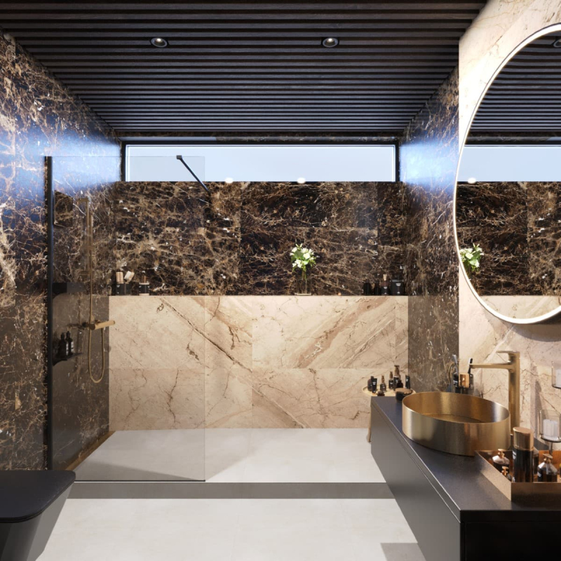 Rektifikované. Mrazuvzdorné. Dlažba vo farebnom prevedení breccia aurora v imitácii mramoru o rozmere 59,8x119,8 cm a hrúbke 6 mm s lesklým povrchom. Vhodné iba do interiéru. S veľkými rozdielmi v odtieni farieb, štruktúry povrchu a kresby.
