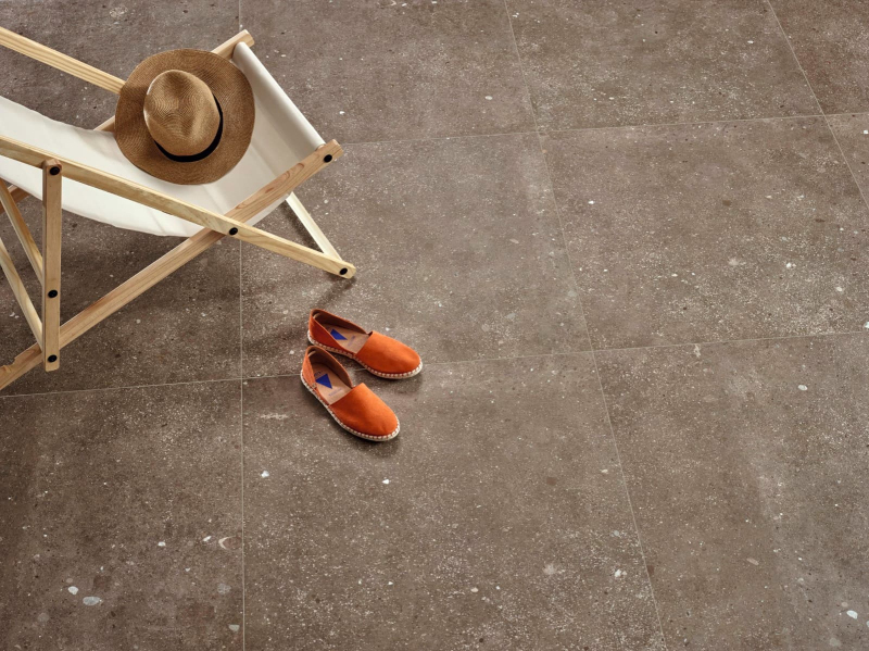 Rektifikované. Mrazuvzdorné. Dlažba vo farbe brown av imitácii betónu o rozmere 120x120 cm a hrúbke 10,5 mm s matným povrchom. Vhodné do interiéru aj exteriéru. S veľkými rozdielmi v odtieni farieb, štruktúry povrchu a kresby. Vysoko odolné proti opotrebovaniu. Vhodné do hál hotelov, obchodov a garáže.