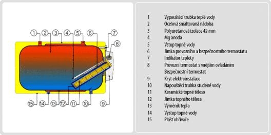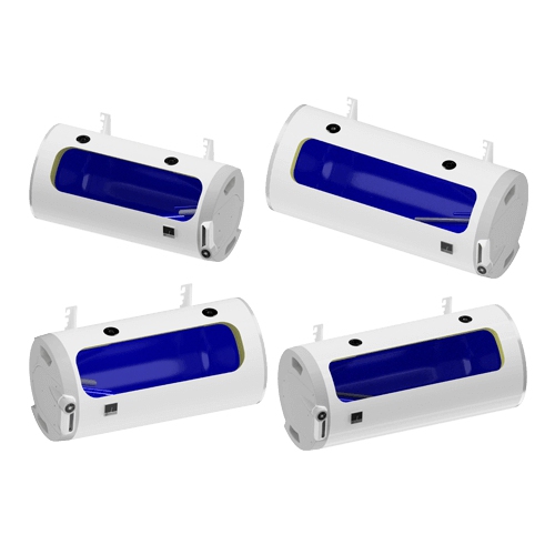 Charakteristika ohrievačov Pracovná poloha – vodorovná Kombinovaný akumulačný ohrievač s vodorovnou pracovnou polohou do priestorov s nedostatkom miesta s objemom 125–200 litrov. Ohrievač môže byť upevnený na stene pomocou dodávaných konzol alebo pripevnený vo vodorovnej polohe ku vhodnej konštrukcii pomocou závesov (nutné priobjednať). Vždy treba počítať s dostatkom miesta nad a pod ohrievačom pre montáž prívodného potrubia. Možnosti ohrevu Elektrickou energiou. Keramické vykurovacie teleso ovládané prevádzkovým termostatom a istené bezpečnostným termostatom (tepelnou poistkou). Teplotný rozsah 7–77 stupňov Celzia. Pripojovacie napätie 1-PE–N/AC 230 V/50 Hz. Elektrické krytie IP 44 umožňuje umiestnenie ohrievača do zóny 2 podľa ČSN 33 2000-7-701. Výmenníkom. Ohrievač je možné napojiť na externý teplovodný zdroj s max. teplotou 110 stupňov Celzia a tlaku 0,4 MPa. Ohrev zaisťuje výkonný dvojplášťový výmenník vrstvením teplej vody. Výmenník ohreje najprv vodu v hornej časti nádoby a potom ohrieva spodné vrstvy objemu. Tento spôsob postupného ohrevu je vhodný zvlášť k samotiažnym ústredným vykurovaniam a malým samotiažnym solárnym systémom. Výmenník pracuje v nútenom obehu aj v samotiažnom systéme. Čidlo regulácie vykurovacej vody je možné vložiť do spoločnej nádrže s čidlami elektroinštalácie. Využitie Príprava TÚV pre objekty s teplovodným ústredným vykurovaním na plyn, tuhé palivá v zimnom období. Ohrev elektrickou energiou mimo vykurovacej sezóny s možnosťou využitia nízkej tarify elektrickej energie (nočný prúd). Príslušenstvo: Poistný ventil Sada závesov na upevnenie na vodorovnú konštrukciu Výbava na želanie Cirkulačný vstup