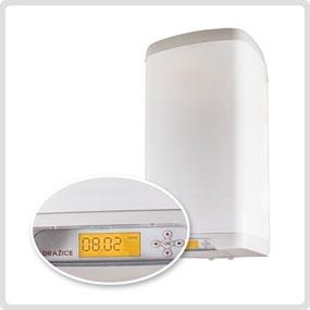 Inteligentný ohrievač vody s elektronickým termostatom E1 s možnosťou pripojenia na HDO, s využitím nízkej tarify. Funkcia SMART prispôsobí prevádzku ohrievača presne podľa vašich potrieb a tým dosiahnete ešte väčšie úspory. Ohrievač je určený na tzv. akumulačný ohrev úžitkovej vody elektrickou energiou. Vodu ohrieva elektrické teleso v smaltovanom tepelne izolovanom zásobníku. Teleso je v dobe ohrevu ovládané elektronickým termostatom E1, ktorý umožňuje niekoľko režimov prevádzky a poskytuje niekoľko komfortných funkcií. Termostat obsahuje displej, nastavovanie sa vykonáva päť-klávesovou klávesnicou (šípky + OK). Po dosiahnutí zvolenej teploty sa ohrev automaticky preruší. Viac o možnostiach úspor energie nájdete v samostatnom návode k elektronickému termostatu E1 - viď.napr. funkcie SMART.