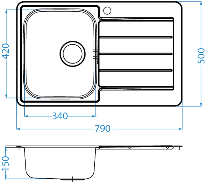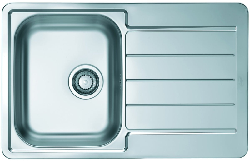 Nerezový jednodřez s odkapávačem s montáží na pracovní desku o rozměru 79x50 cm a hloubkou 16 cm. Vhodný pro montáž do skříňky o šířce 45 cm.
