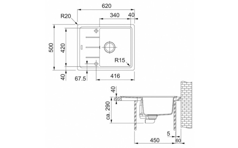 Granitový jednodřez s odkapávačem v barvě šedý kámen s montáží na pracovní desku o rozměru 62x50 cm a hloubkou 20 cm. Vhodný pro montáž do skříňky o šířce 45 cm.