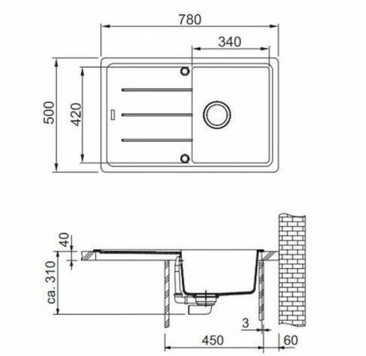 Granitový jednodřez s odkapávačem onyxový s montáží na pracovní desku o rozměru 78x50 cm a hloubkou 20 cm. Vhodný pro montáž do skříňky o šířce 45 cm.