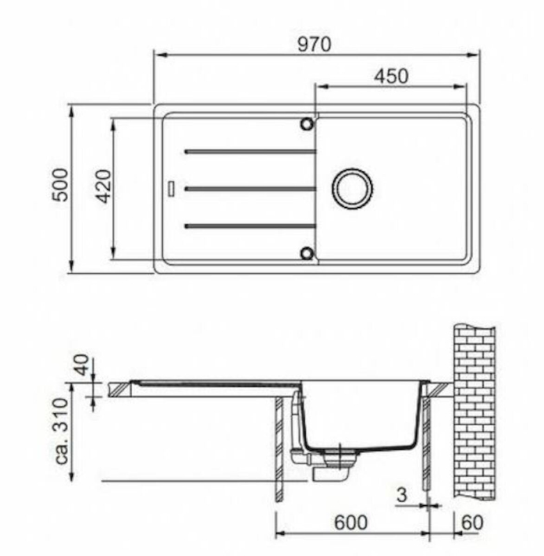Granitový jednodřez s odkapávačem onyxový s montáží na pracovní desku o rozměru 97x50 cm a hloubkou 19 cm. Vhodný pro montáž do skříňky o šířce 60 cm.