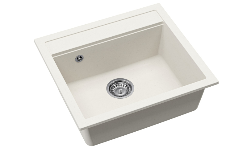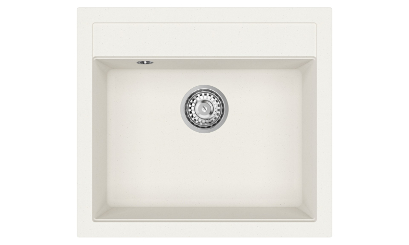 Granitový jednodrez biely s montážou na pracovnú dosku o rozmere 56,5x51 cm a hĺbkou 20 cm. Vhodný na montáž do skrinky so šírkou 60 cm.