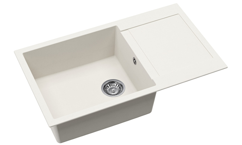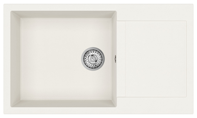 Granitový jednodrez s odkvapkávačom biely s montážou na pracovnú dosku o rozmere 86x50 cm a hĺbkou 20 cm. Vhodný na montáž do skrinky so šírkou 60 cm.