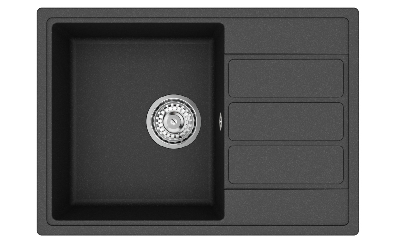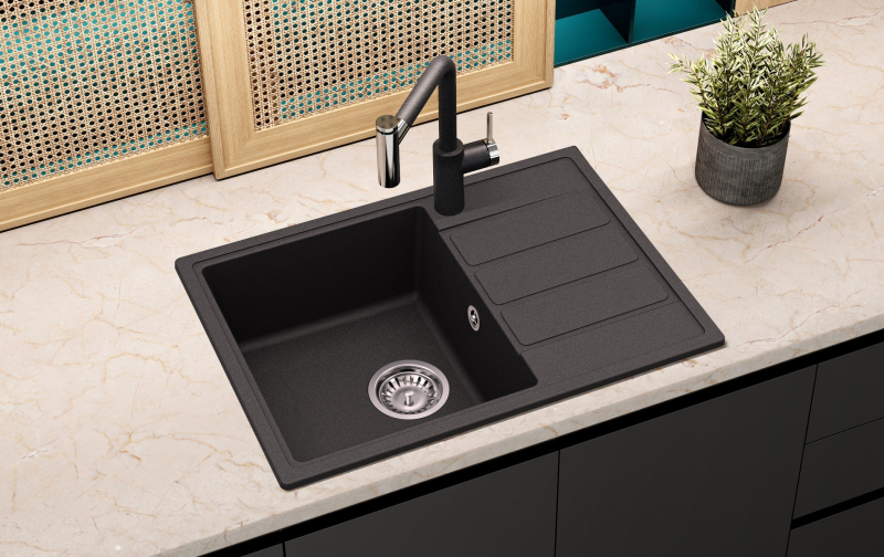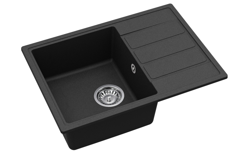 Granitový jednodrez s odkvapkávačom čierny s montážou na pracovnú dosku o rozmere 62x44 cm a hĺbkou 17 cm. Vhodný na montáž do skrinky so šírkou 45 cm.
