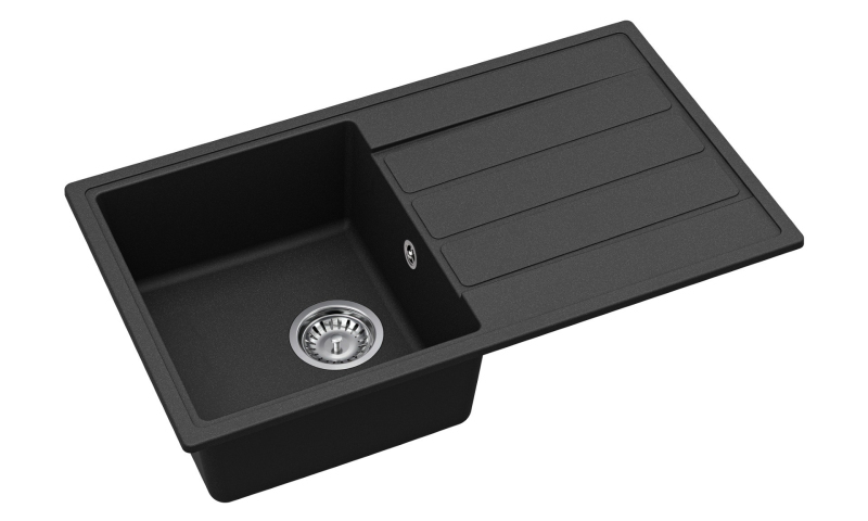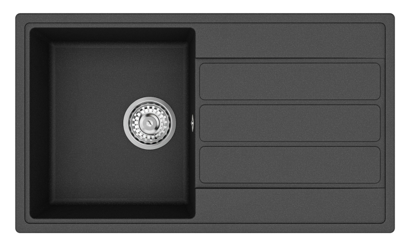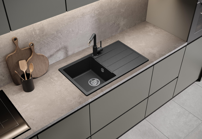 Granitový jednodrez s odkvapkávačom čierny s montážou na pracovnú dosku o rozmere 76x44 cm a hĺbkou 17 cm. Vhodný na montáž do skrinky so šírkou 45 cm.