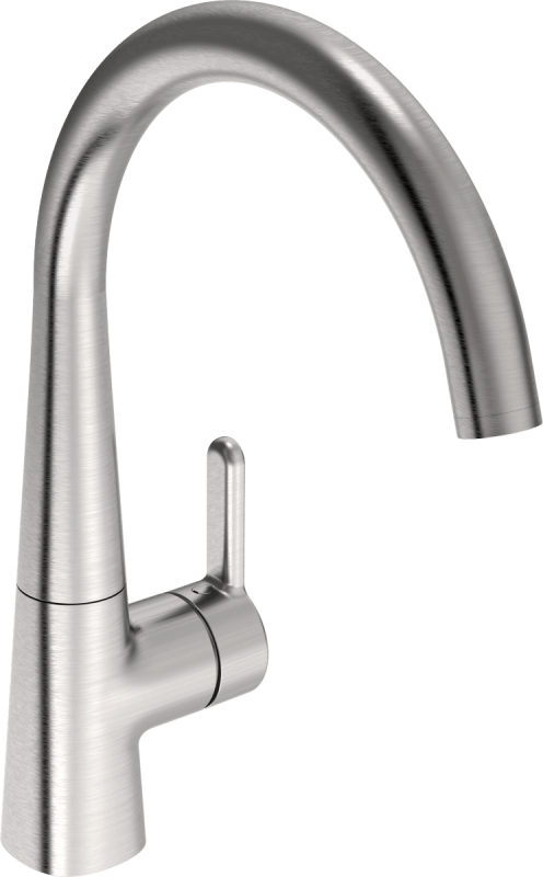 Páková stojanková drezová batéria s otočným ramienkom v prevedení brúsená oceľ. Prietok batérie je 12 litrov/minútu. Výška batérie je 34,8 cm. Ramienko je vo výške 23,9 cm. S matným povrchom.