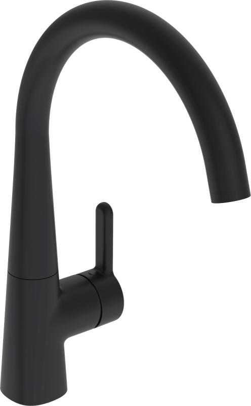 Páková stojanková drezová batéria s otočným ramienkom vo farbe čierna matná. Prietok batérie je 12 litrov/minútu. Výška batérie je 34,8 cm. Ramienko je vo výške 23,9 cm. S matným povrchom.
