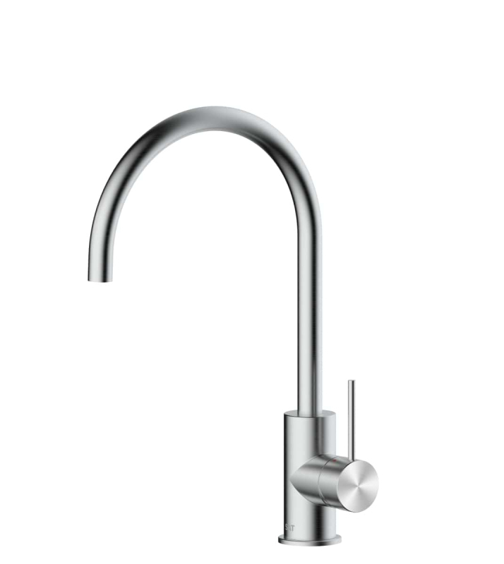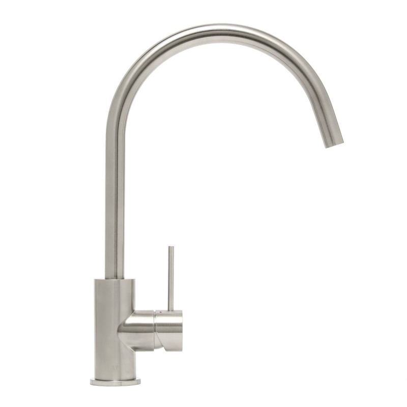 Páková stojanková drezová batéria s otočným ramienkom. V okrúhlom dizajne v nerezovom prevedení. Výška batérie je 36,3 cm. Ramienko je vo výške 23,2 cm. S matným povrchom