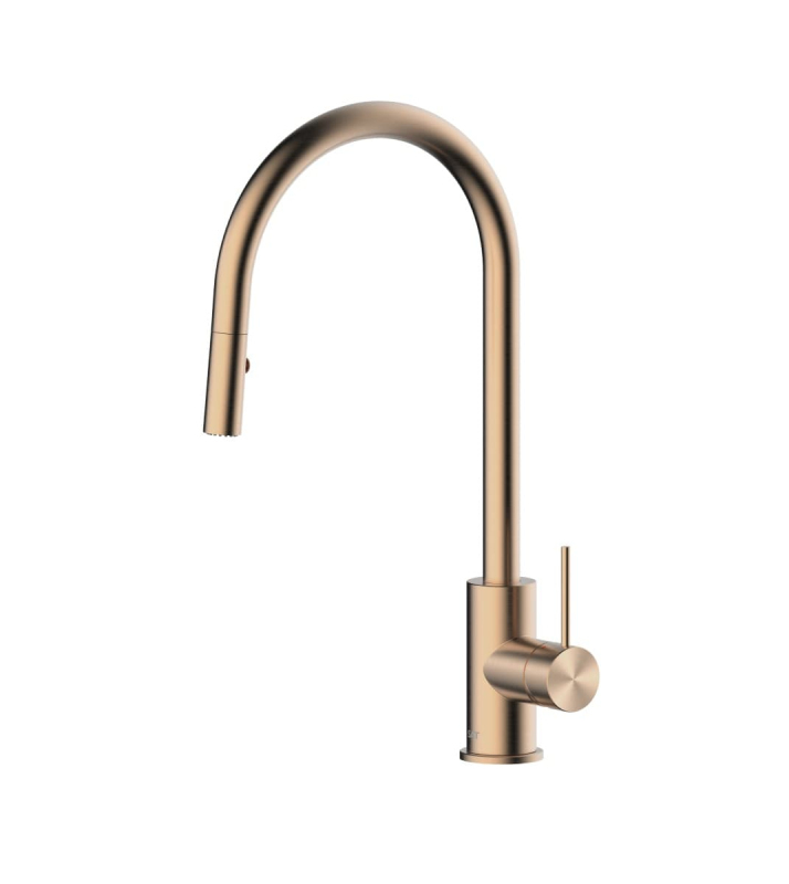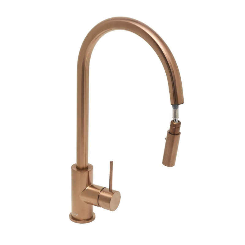 Páková stojanková drezová batéria s vyťahovacou sprškou, 2 prúdy. V okrúhlom dizajne vo farebnom prevedení brúsená rose gold. Výška batérie je 44 cm. Ramienko je vo výške 23,5 cm. S matným povrchom