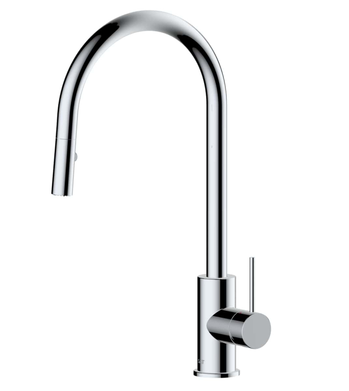 Páková stojanková drezová batéria s vyťahovacou sprškou, 2 prúdy. V okrúhlom dizajne v chrómovom prevedení. Výška batérie je 44 cm. Ramienko je vo výške 23,5 cm. Vo farebnom prevedení lesk