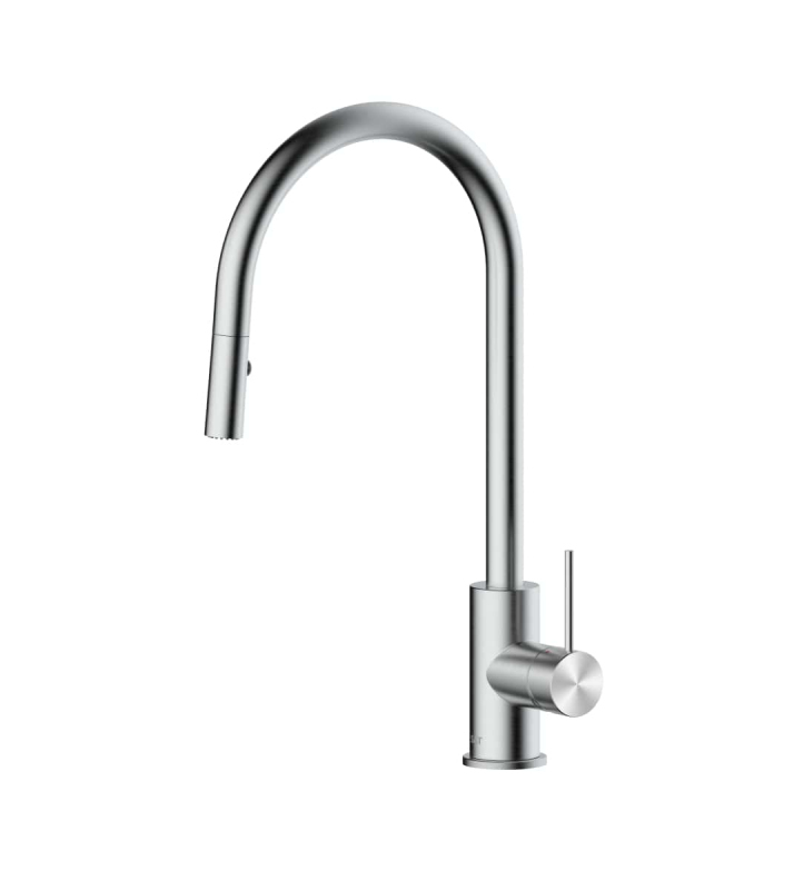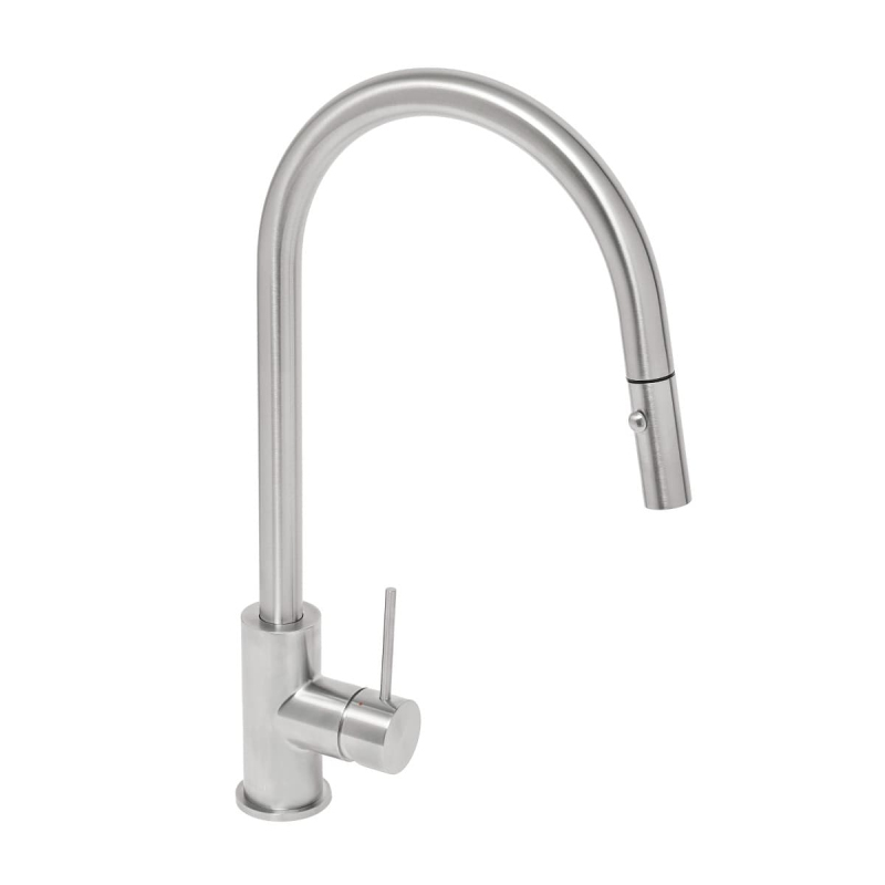 Páková stojanková drezová batéria s vyťahovacou sprškou, 2 prúdy. V okrúhlom dizajne v nerezovom prevedení. Výška batérie je 44 cm. Ramienko je vo výške 23,5 cm. S matným povrchom