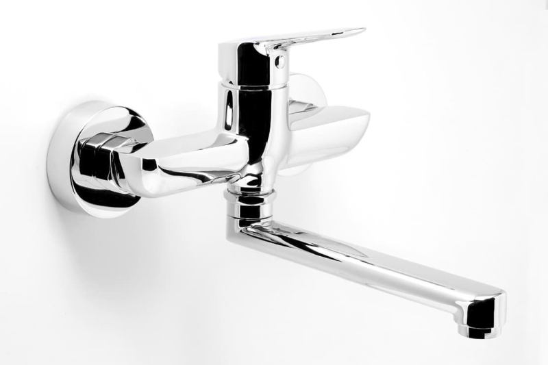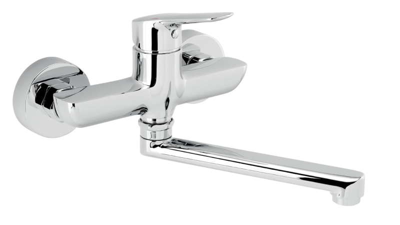 Páková nástenná drezová - umývadlová batéria s otočným ramienkom v chrómovom prevedení. Rozteč batérie 150 mm. Vo farebnom prevedení lesk.