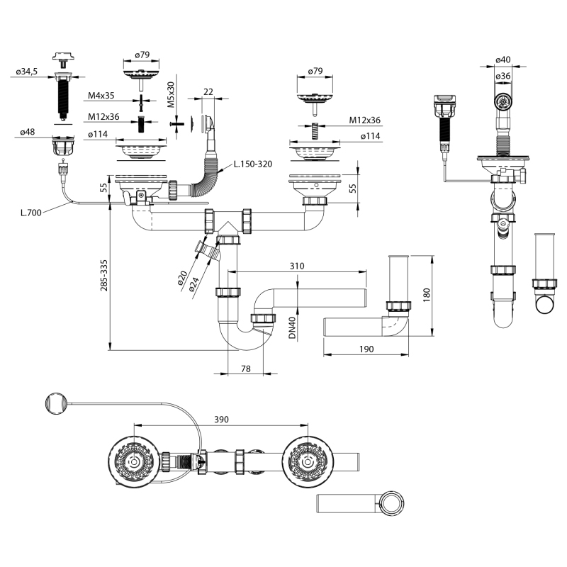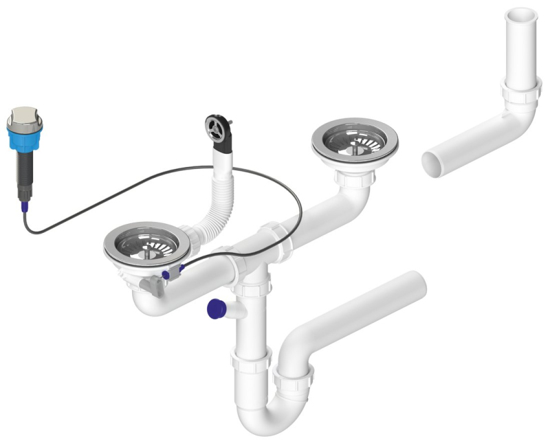 Drezový sifón s prepadom, ovládaním a odbočkou, 6/4", pre dvojdrez, vrátane pilety, DN40, biela