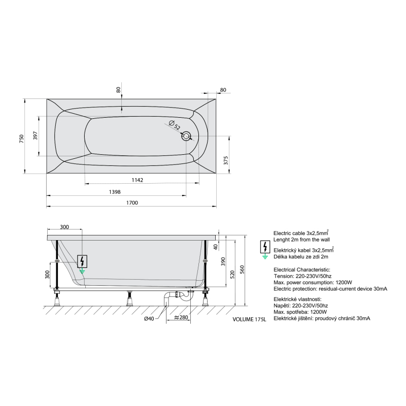EBRO hydromasážna vaňa, 170x75x39cm, Active Hydro, chróm 56938