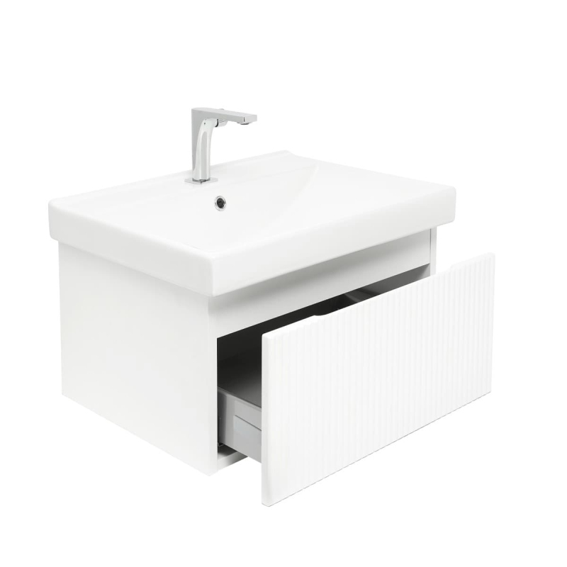 Závesná kúpeľňová skrinka s batériou a keramickým umývadlom v bielej farbe s matným povrchom o rozmere 58x30x44,8 cm. Povrch v prevedení lamino.