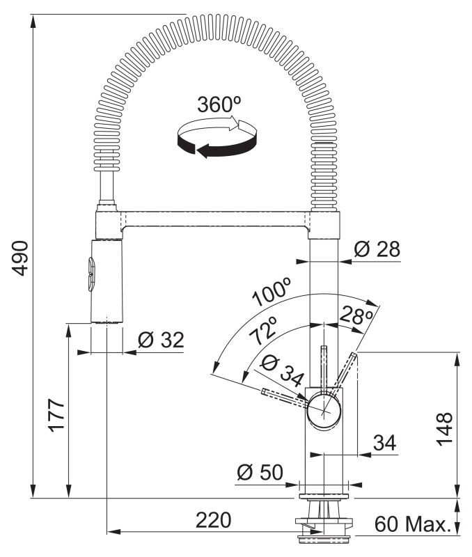 Stojanková drezová batéria, prevedenie Chróm, výška 490 mm, perlátor na pružine s prepínačom na sprchu, pre otvor 35 mm, otočná o 360°.