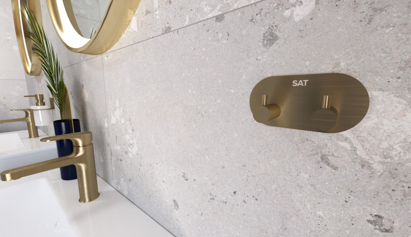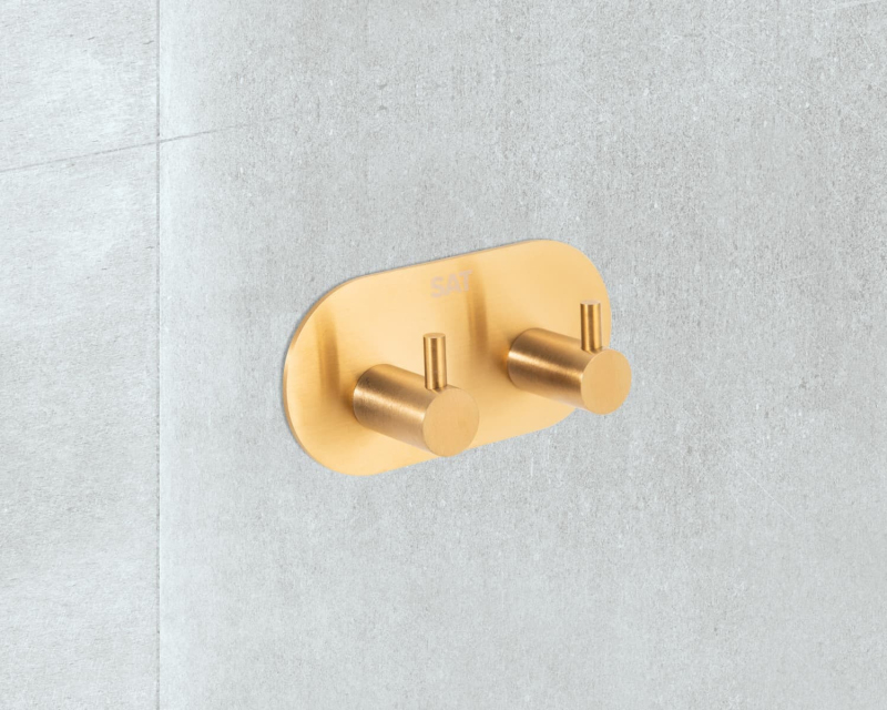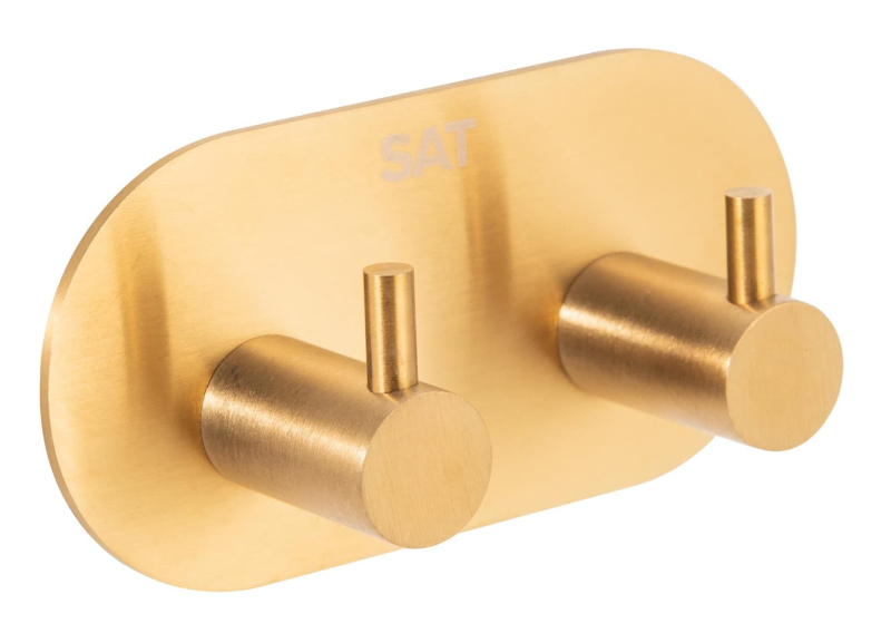Háček v barevném provedení broušené zlato. Šířka tohoto koupelnového doplňku od značky SAT je 9,5 cm a je vyroben z materiálu nerez. Montáž bez nutnosti vrtání, pouze lepením.