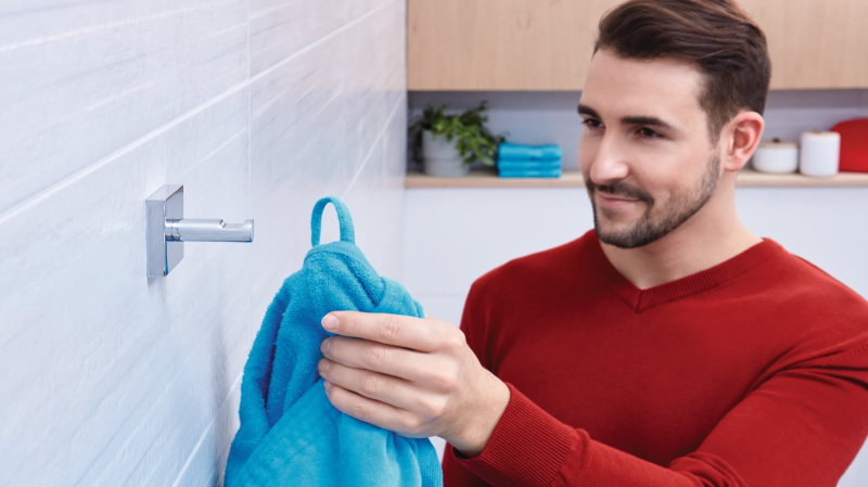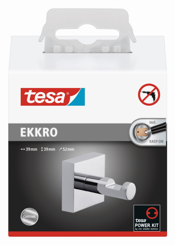 Hranatý háček na ručník tesa® Ekkro je atraktivní a praktický, protože může být bez problémů použit i pro těžší předměty, jako jsou župany nebo vysoušeče vlasů. To vše díky technologii lepení tesa® Power.Kit, která se snadno aplikuje a je připravena k použití po uplynutí 12 hodin vytvrzení lepidla. Žádné další nástroje nejsou třeba. Ty se použijí pouze pro bezezbytkové odstranění háčku a ten lze pak snadno namontovat na jiné místo pomocí nového adaptéru BK44.