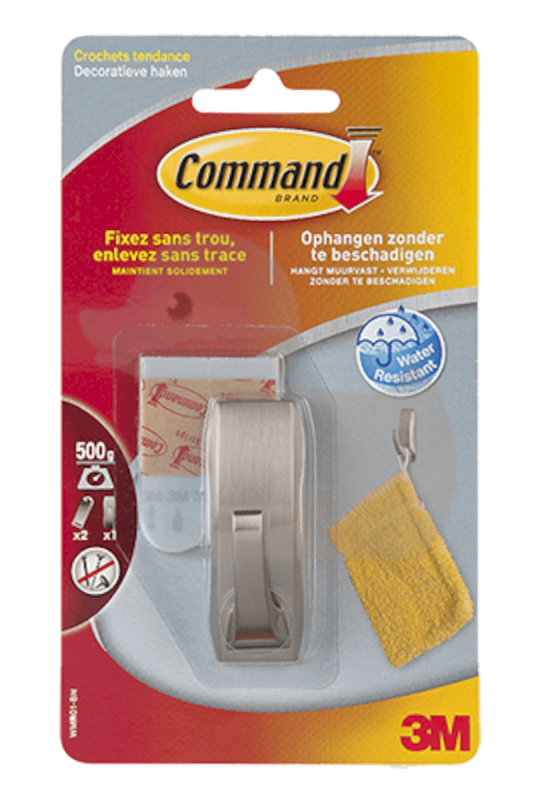 Háčik 3M zo série Command ponúka jednoduchší, pritom však výkonný spôsob pre zavesovanie oproti vŕtaniu, kladivu či klincom. Ideálne je možné použiť na zavesovanie predmetov do kúpeľne či na akékoľvek iné miesto v domácnosti. Nosnosť 0,45 kg.