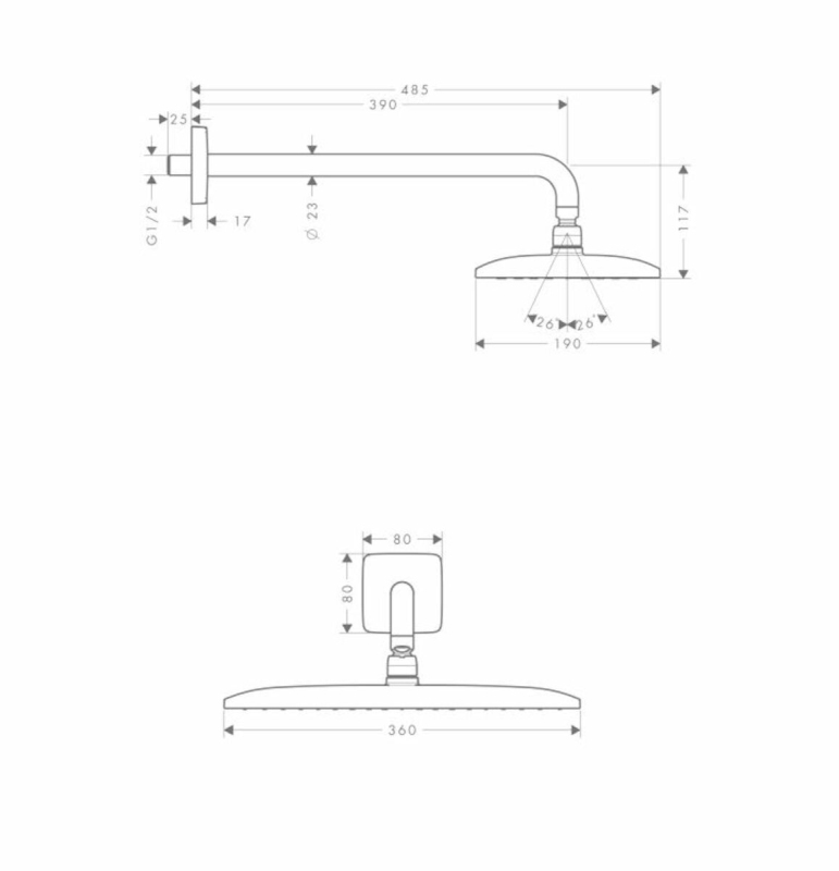 Hlavová sprcha vrátane sprchového ramena s montážou na stenu s 1 funkciou. Prietok 17 litrov/minútu.