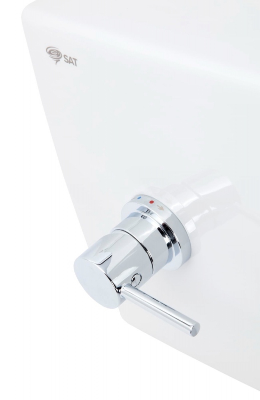 Ovládanie bidetovacej funkcie je umiestnené po pravej ruke, kde je na boku misy páková batéria s možnosťou nastavenia intenzity a teploty vody z bidetovacej trysky. Páková batéria má termostatickú funkciu, ktorá vás ochráni pred nechceným obarením. Maximálna teplota vody je obmedzená na 38 °C. Táto hodnota nie je na batérii zobrazená, ale dosiahnete ju pri maximálnom otočení páky na stranu červenej značky znázorňujúcu teplú vodu.