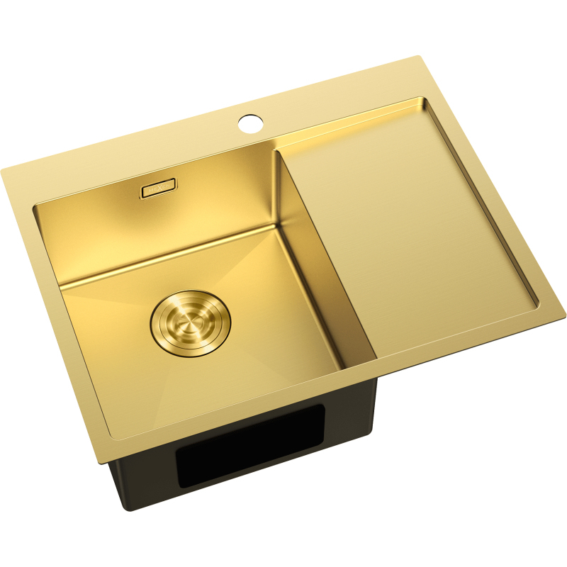 Špecifikácia produktu: Rozmer: 620x480x200 mm Hĺbka drezu: 200 mm Rozmery drezu: 380x350 mm Hrúbka oceľového hrán drezu: 3 mm Hrúbka oceľového hrán drezu: 1 mm Polomer zaoblenia rohov drezu: R10 Priemer odtoku Typ: Vstavaný, Ľavý Materiál: Nerezová oceľ AISI 304 Farba: Zlatá Povrch: Hladký Povrchová úprava sifónu: Zlatá Otvor pre prepad: Áno Otvor pre batériu: Áno Ručný sifón s odpadkovým košom a zátkou Prídavný kryt odtoku Skrytý otvor pre prepad Zvukovo poškriabaniu a zmene farby Odolnosť voči vysokým teplotám a tepelným šokom Povrch pre ľahké čistenie