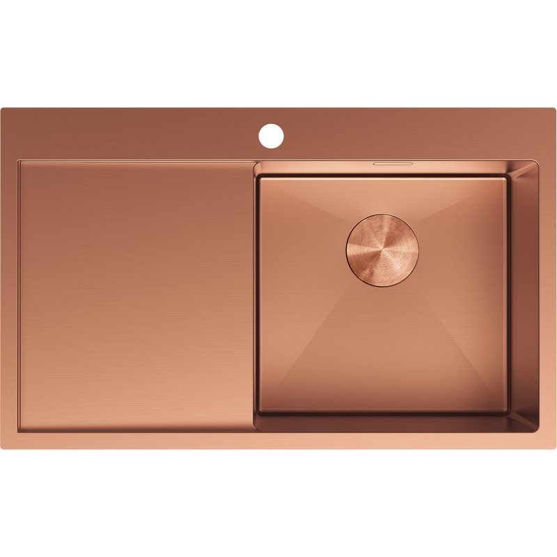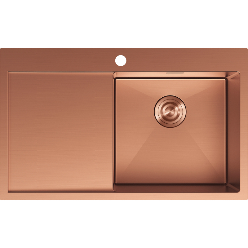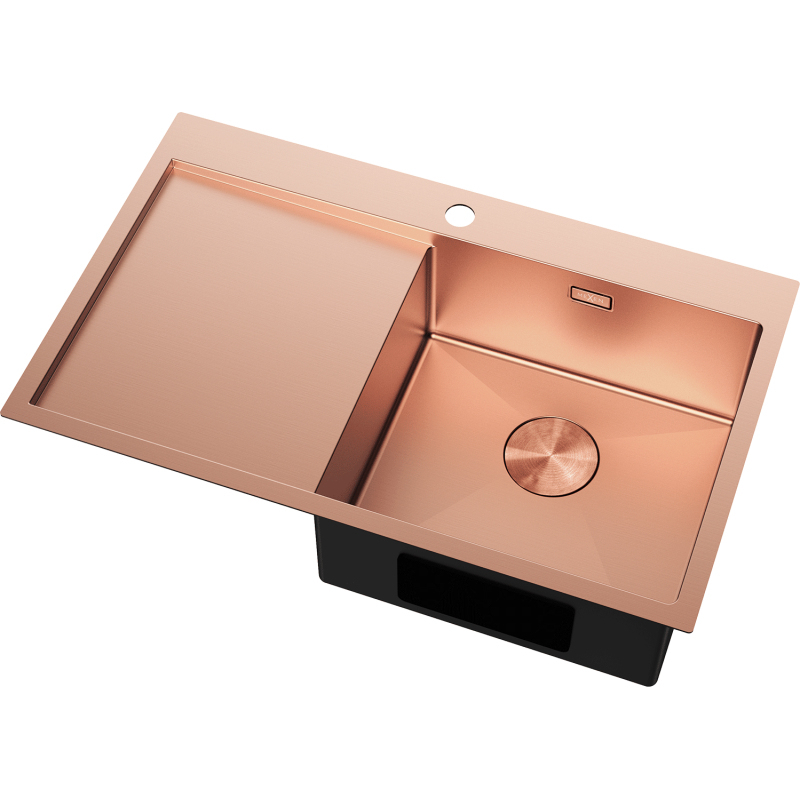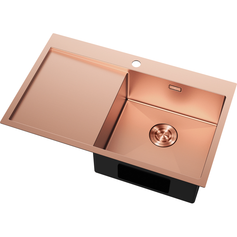 Špecifikácia produktu: Rozmer: 780x480x200 mm Hĺbka drezu: 200 mm Rozmery drezu: 400x380 mm Hrúbka oceľového hrán drezu: 3 mm Hrúbka oceľového hrán drezu: 1 mm Polomer zaoblenia rohov drezu: R10 Priemer odtoku odtokom Typ: Vstavaný, pravý Materiál: Nerezová oceľ AISI 304 Farba: Meď Povrch: Hladký Povrchová úprava sifónu: Meď Prepadový otvor: Áno Otvor pre batériu: Áno Ručný sifón s odpadkovým košom a zátkou Prídavný kryt odtoku Skrytý prepadový otvor Zvu poškriabaniu a zmene farby Odolnosť voči vysokým teplotám a tepelným šokom Povrch pre ľahké čistenie