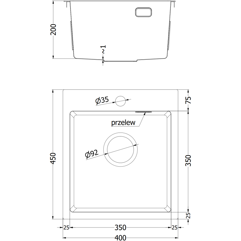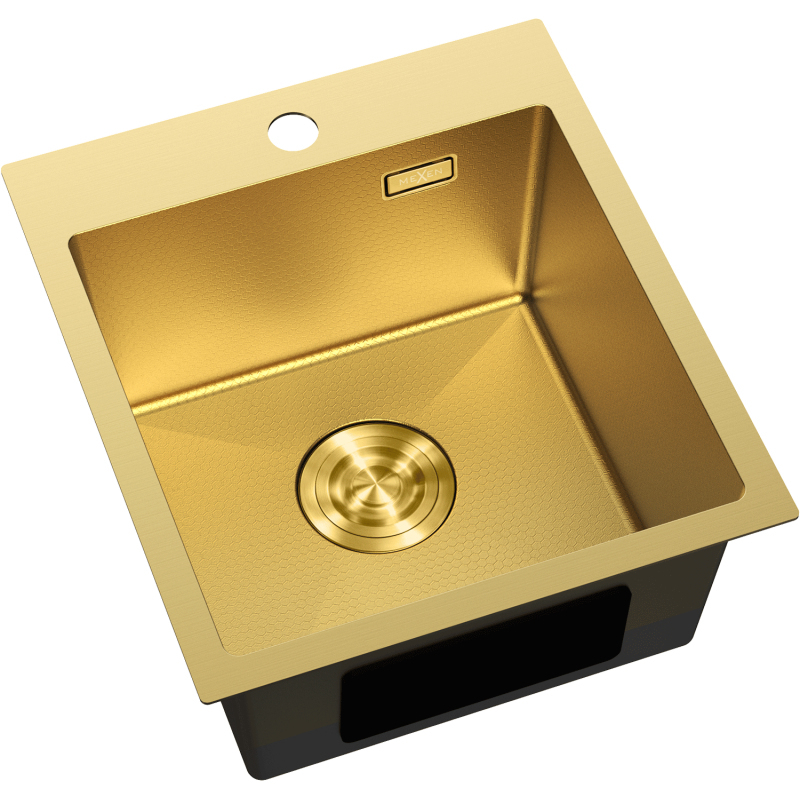Špecifikácia produktu: Rozmer: 400x450x200 mm Hĺbka drezu: 200 mm Rozmery drezu: 350x350 mm Hrúbka oceľového hrán drezu: 3 mm Hrúbka oceľového hrán drezu: 1 mm Polomer zaoblenia rohov drezu: Typ1-2 Materiál: Nerezová oceľ AISI 304 Farba: Zlatá Povrch: Voština Povrchová úprava sifónu: Zlatá Otvor pre prepad: Áno Otvor pre batériu: Áno Ručný sifón s odpadkovým košom a zátkou Prídavný kryt odtoku Skrytý otvor pre prepad Zvukovo izolačné rohože k drezu Odolnosť voči vysokým teplotám a tepelným šokom Ľahko čistiteľný povrch