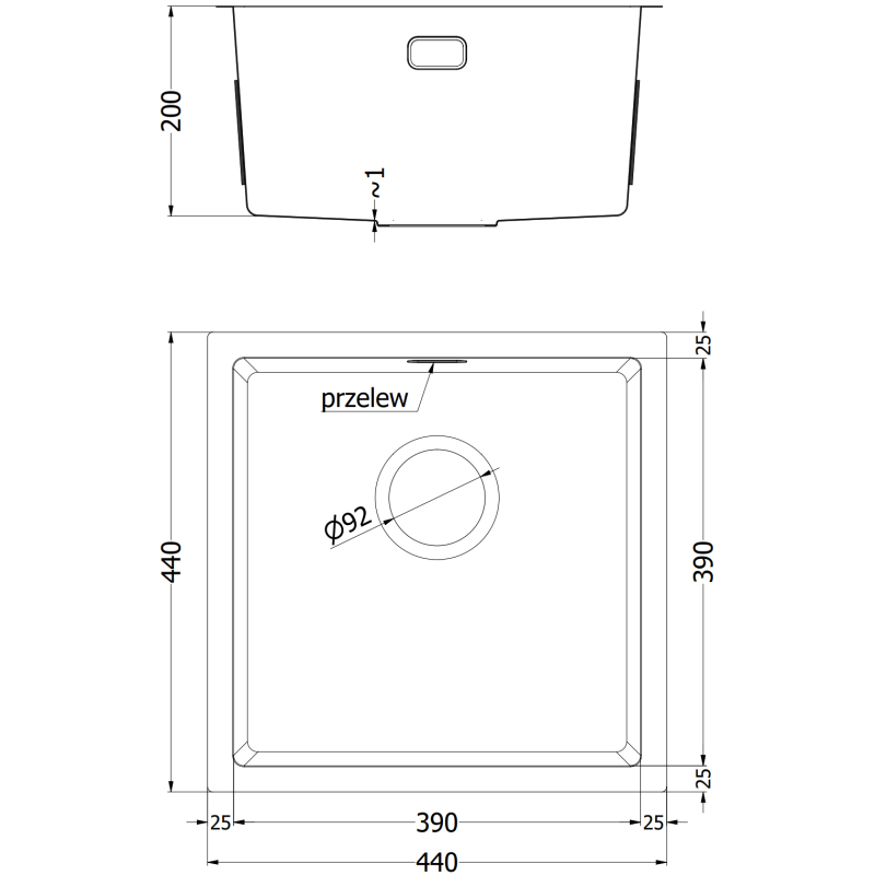 Špecifikácia produktu: Rozmer: 440x440x200 mm Hĺbka drezu: 200 mm Rozmery drezu: 390x390 mm Hrúbka oceľového hrán drezu: 3 mm Hrúbka oceľového hrán drezu: 1 mm Polomer zaoblenia rohov drezu: R10 Priemer odtoku Pod dosku Materiál: Nerezová oceľ AISI 304 Farba: Meď Povrch: Hladký Povrchová úprava sifónu: Meď Otvor na prepad: Áno Otvor na batériu: Nie Ručný sifón s odpadkovým košom a zátkou Prídavný kryt odtoku Skrytý otvor na prepad Zvukovo izolačná rohož farby Odolnosť voči vysokým teplotám a tepelným šokom Povrch pre ľahké čistenie