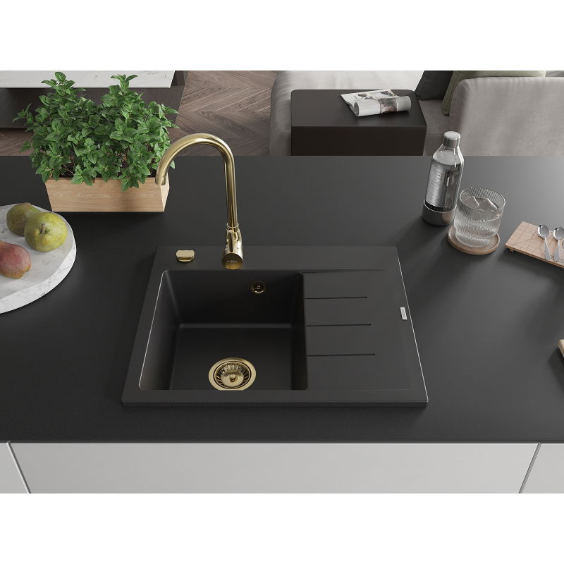 Jednodrezový žulový drez Mexen Ben s odkvapkávačom, ľavý, 600 x 500 mm, čierny, zlatý sifón - 6522605000-77-G