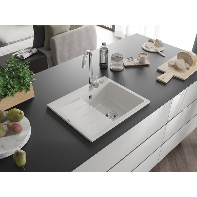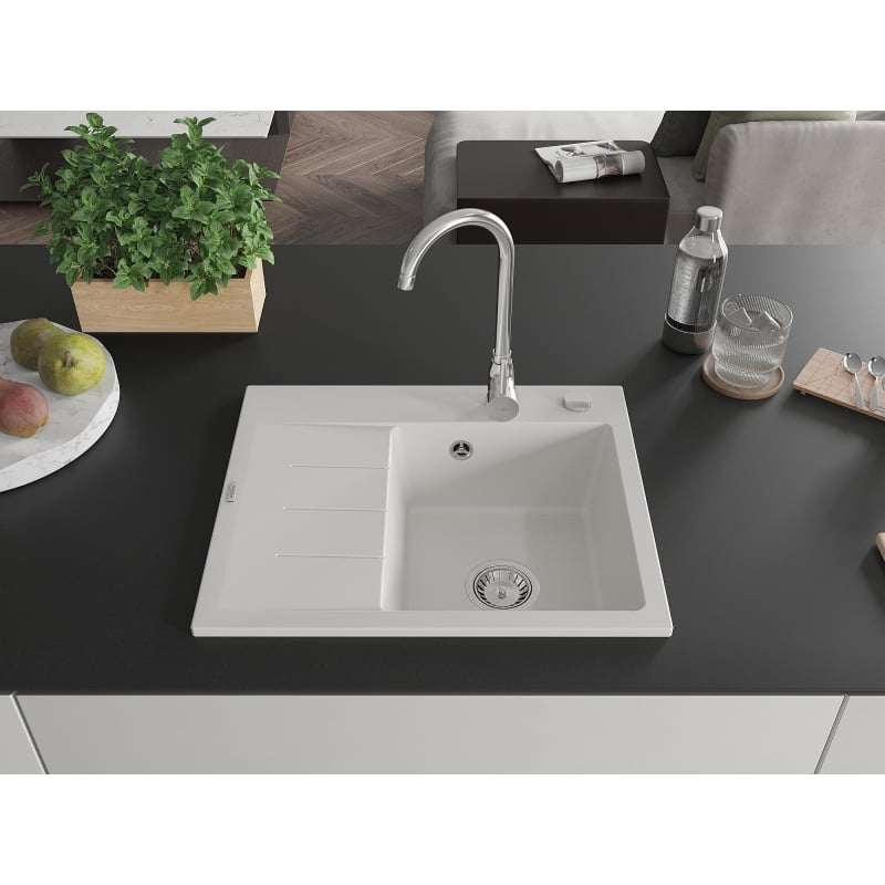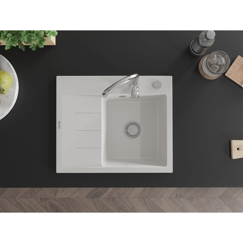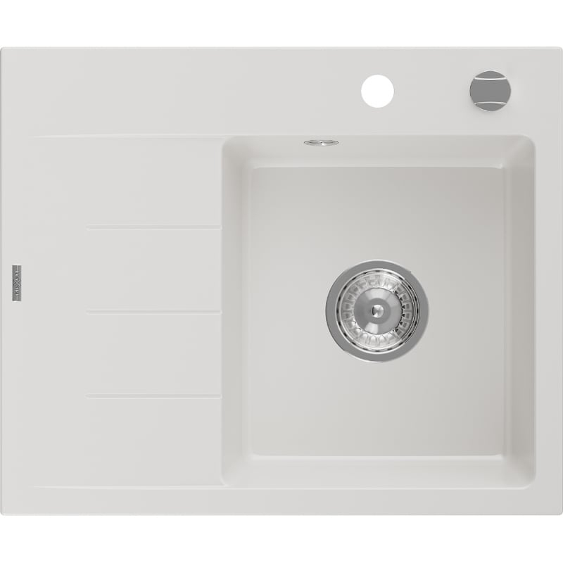 Jednodrezový žulový drez Mexen Ben s odkvapkávačom, pravý, 600 x 500 mm, biely, chrómovaný sifón - 6523605000-20