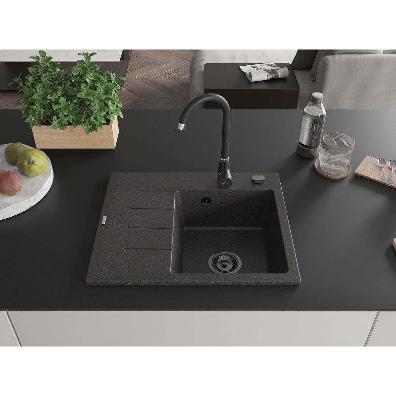 Jednodrezový žulový drez Mexen Ben s odkvapkávačom, pravý, 600 x 500 mm, bodkovaný čierna, čierny sifón - 6523605000-76-B