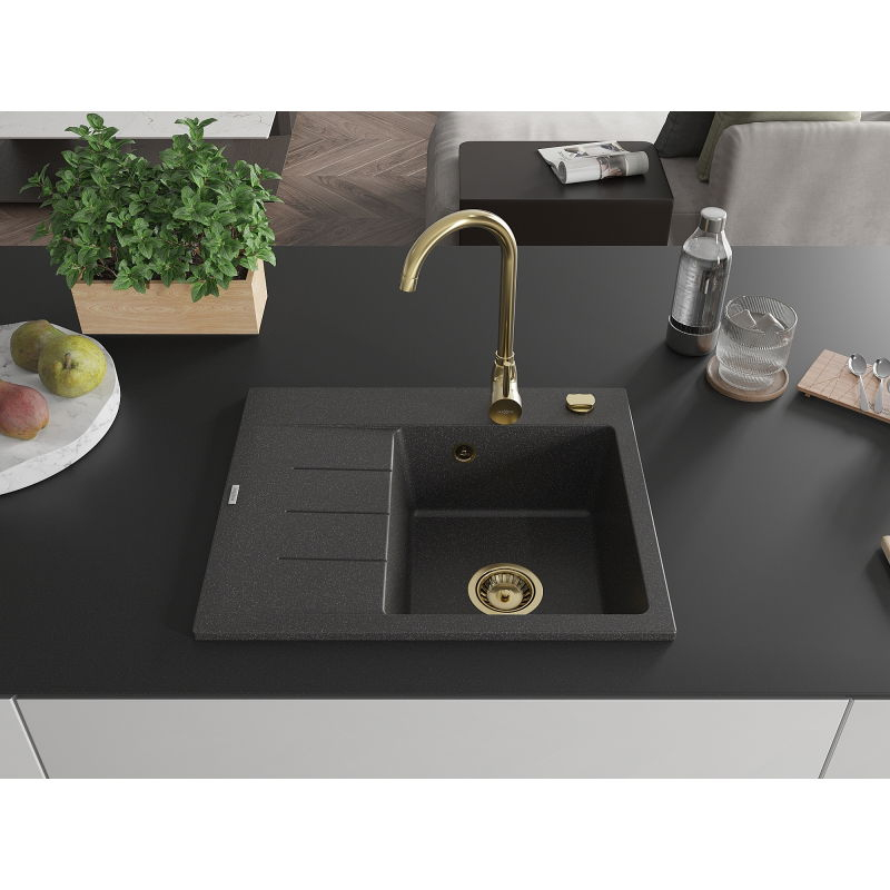 Jednodrezový žulový drez Mexen Ben s odkvapkávačom, pravý, 600 x 500 mm, čierna bodka, zlatý sifón - 6523605000-76-G