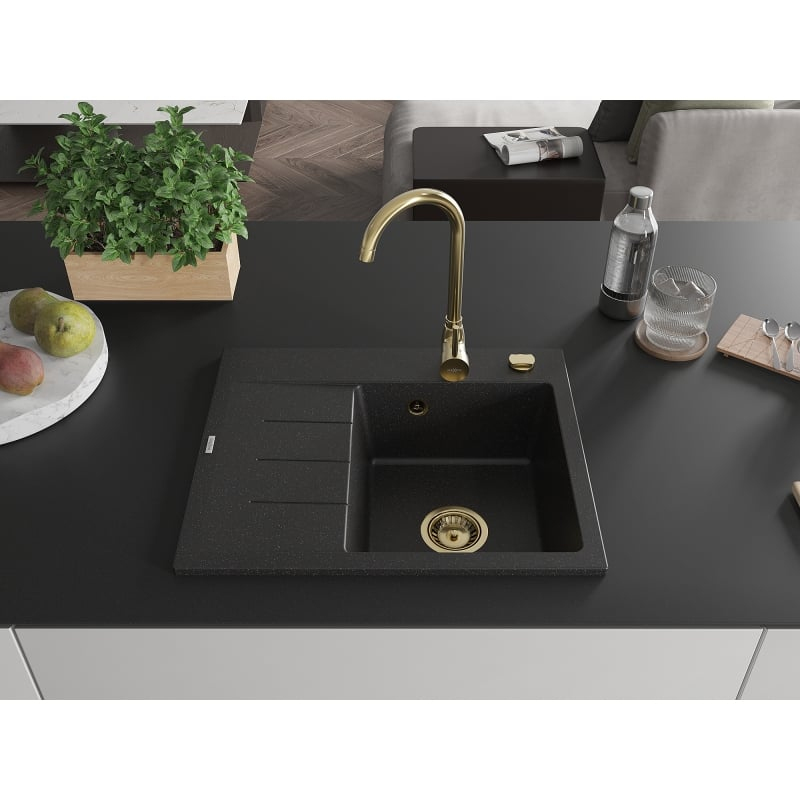 Jednodrezový žulový drez Mexen Ben s odkvapkávačom, pravý, 600 x 500 mm, čierna/strieborná metalíza, zlatý sifón - 6523605000-73-G