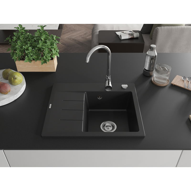 Jednodrezový žulový drez Mexen Ben s odkvapkávačom, pravý, 600 x 500 mm, čierny, chrómovaný sifón - 6523605000-77