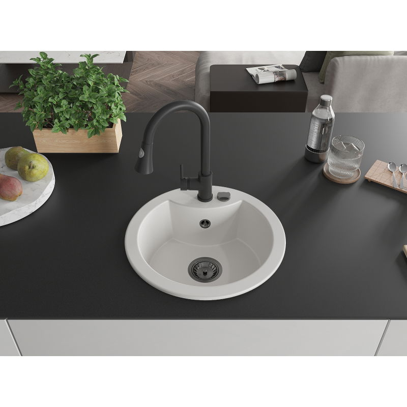 Technické údaje: Drez: Rozmery: 488x488x167 mm Hĺbka drezu: 157 mm Šírka drezu: 406 mm Priemer odtoku: ø90 mm Typ: 1-drezový Typ: Vstavaný Farba: Biela Povrchová úprava sifónu: Čierna Materiál: Žula (80 %) Prepadový otvor: Áno Otvory: (automatická batéria) 2 Vysoká odolnosť proti poškriabaniu a zmene farby Odolnosť voči teplotným šokom Povrch pre ľahké čistenie Jeden ďalší vyfrézovaný otvor pre samovŕtanie ø35 Kuchynská batéria: Materiál: Mosadz Farba: Čierna Kartuša: Keramická Perlátor: Áno Typ: Pá mm Typ výtoku: Výsuvný