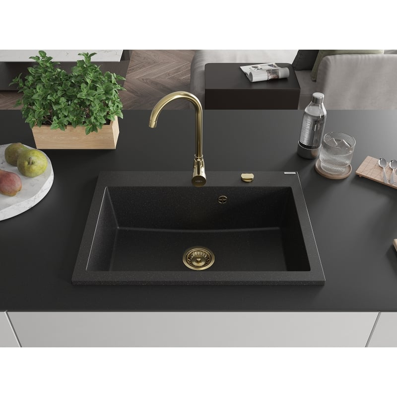 Jednodrezový žulový drez Mexen Elix 700 x 500 mm, čierna/strieborná metalíza, zlatý sifón - 6526701005-73-G