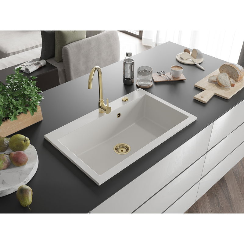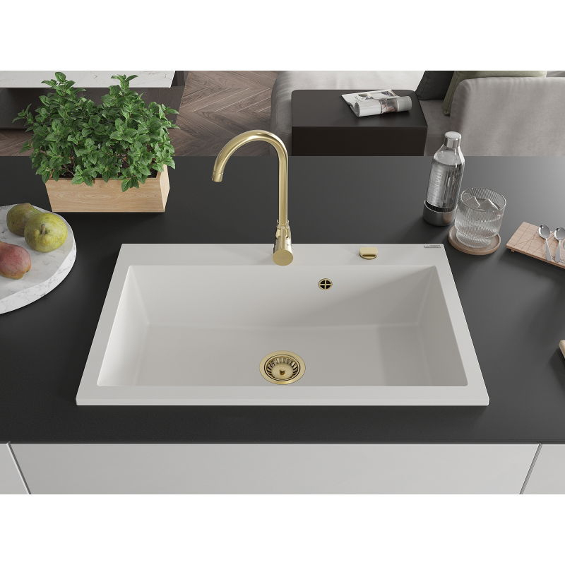 Jednodrezový žulový drez Mexen Elix 800 x 500 mm, biely, zlatý sifón - 6527801005-20-G