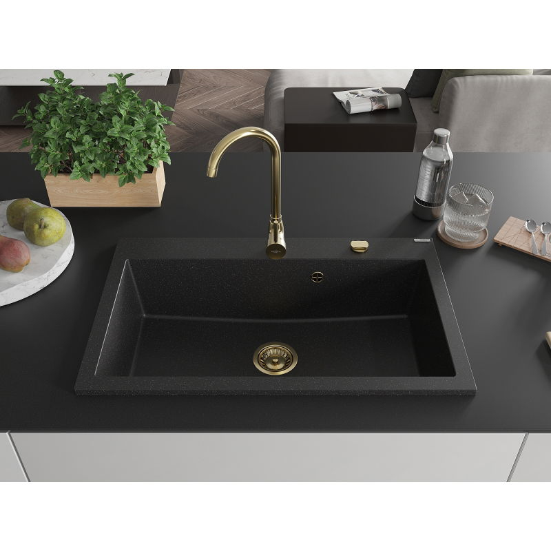 Jednodrezový žulový drez Mexen Elix 800 x 500 mm, čierna/strieborná metalíza, zlatý sifón - 6527801005-73-G