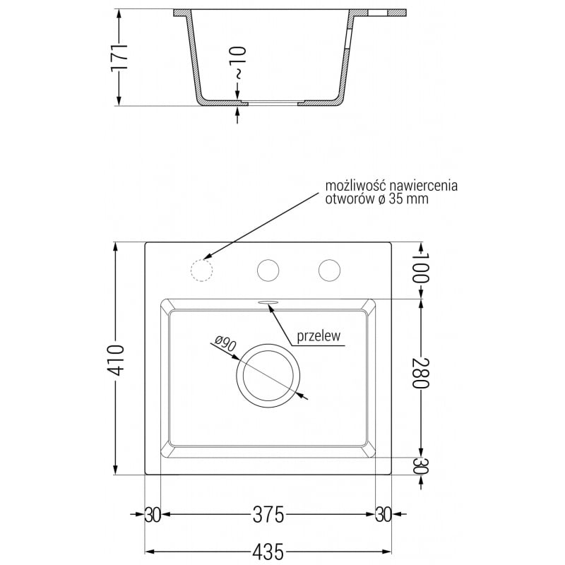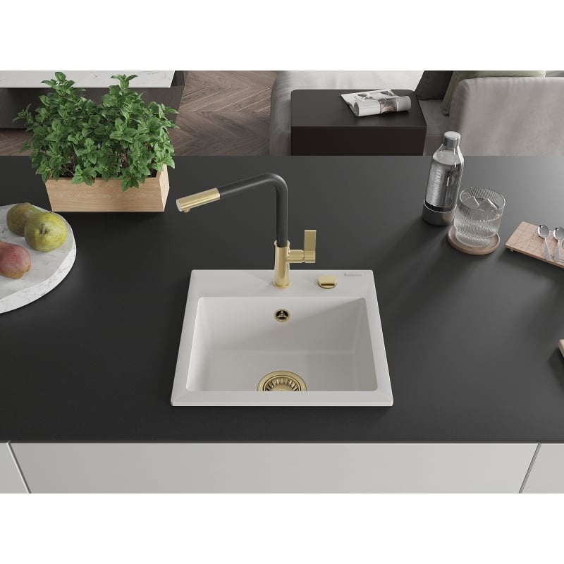 Technické údaje: Drez: Rozmer: 435x410x171 mm Hĺbka drezu: 161 mm Rozmery drezu: 375x280 mm Priemer odtoku: ø90 mm Typ: 1-drezový Typ: Vstavaný Farba: Biela Povrchová úprava sifónu: Zlatá Materiál: Žula živíc) Prepadový otvor: Áno Otvory: (automatická batéria) 2 Vysoká odolnosť proti poškriabaniu a zmene farby Odolnosť voči teplotným šokom Povrch pre ľahké čistenie Jeden ďalší vyfrézovaný otvor pre samovŕtanie ø35 Kuchynská batéria: Materiál: Mosadz Farba: Zlatá/Čierna Kartuša: Keram 245 mm Výška batérie: 307 mm