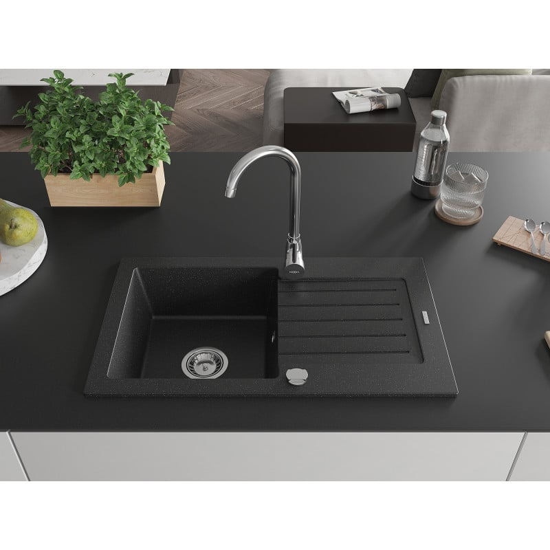 Jednodrezový žulový drez Mexen Pablo s odkvapkávačom 752 x 436 mm, čierna/strieborná metalíza, chrómovaný sifón - 6510751010-73