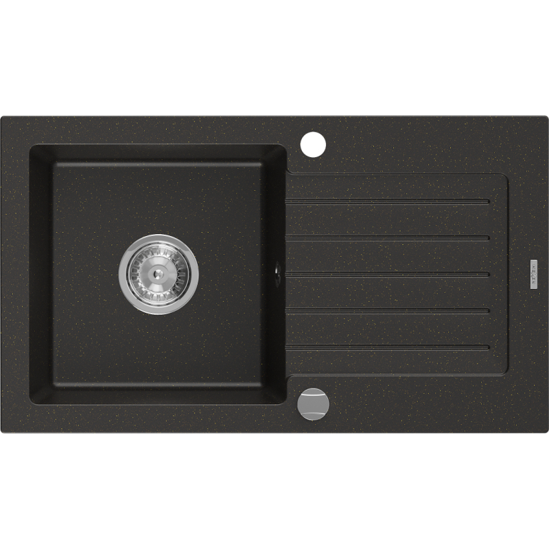 Špecifikácia produktu: Rozmer: 752x436x161 mm Hĺbka drezu: 151 mm Rozmery drezu: 356x332 mm Priemer odtoku: ø90 mm Typ: 1 drez s odkvapkávačom Typ: Vstavaný Materiál: Žula Farba: Čierna / zlatá metalíza Povrchová úprava batériu: Áno Automatický sifón súčasťou balenia Vysoká odolnosť proti poškriabaniu a zmene farby Odolnosť proti teplotným šokom Povrch pre ľahké čistenie Dva ďalšie frézované otvory pre samodierovanie ø35