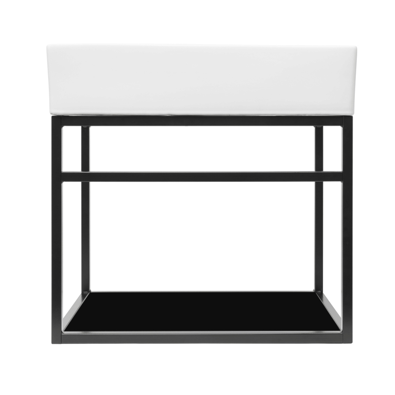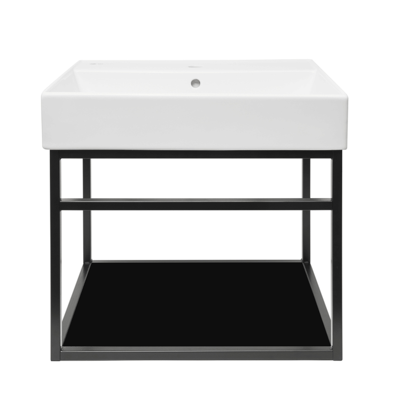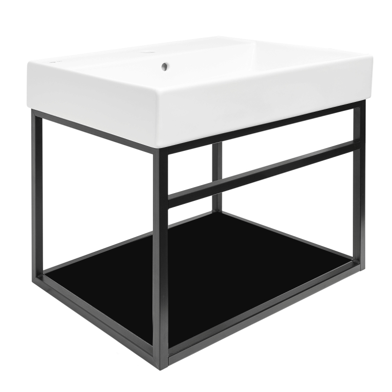 Závesná kúpeľňová skrinka s keramickým umývadlom v čiernej farbe s matným povrchom o rozmere 59x45x45 cm. Materiál oceľ.